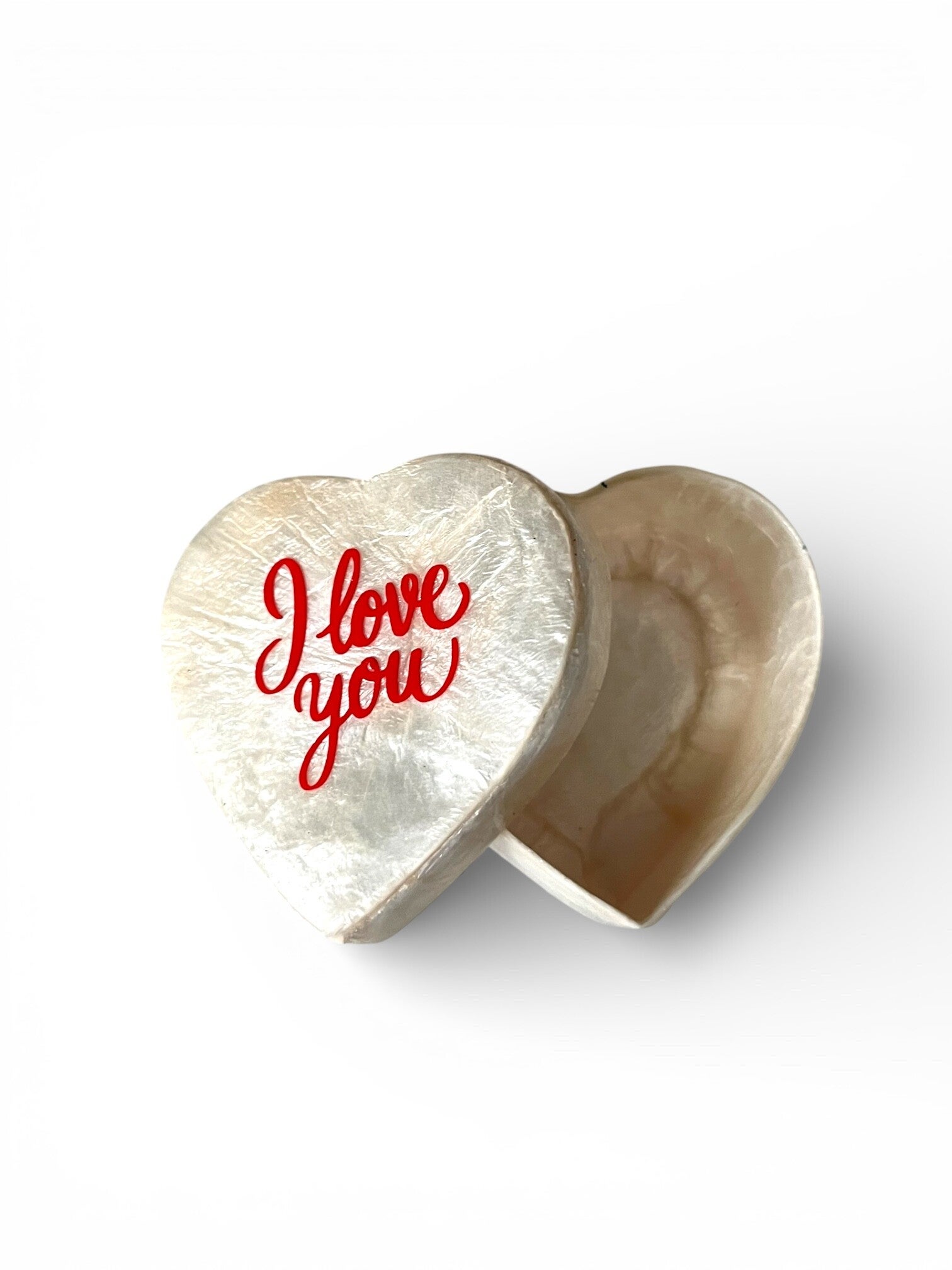 Capiz hartvormig capiz doosje met tekst.
