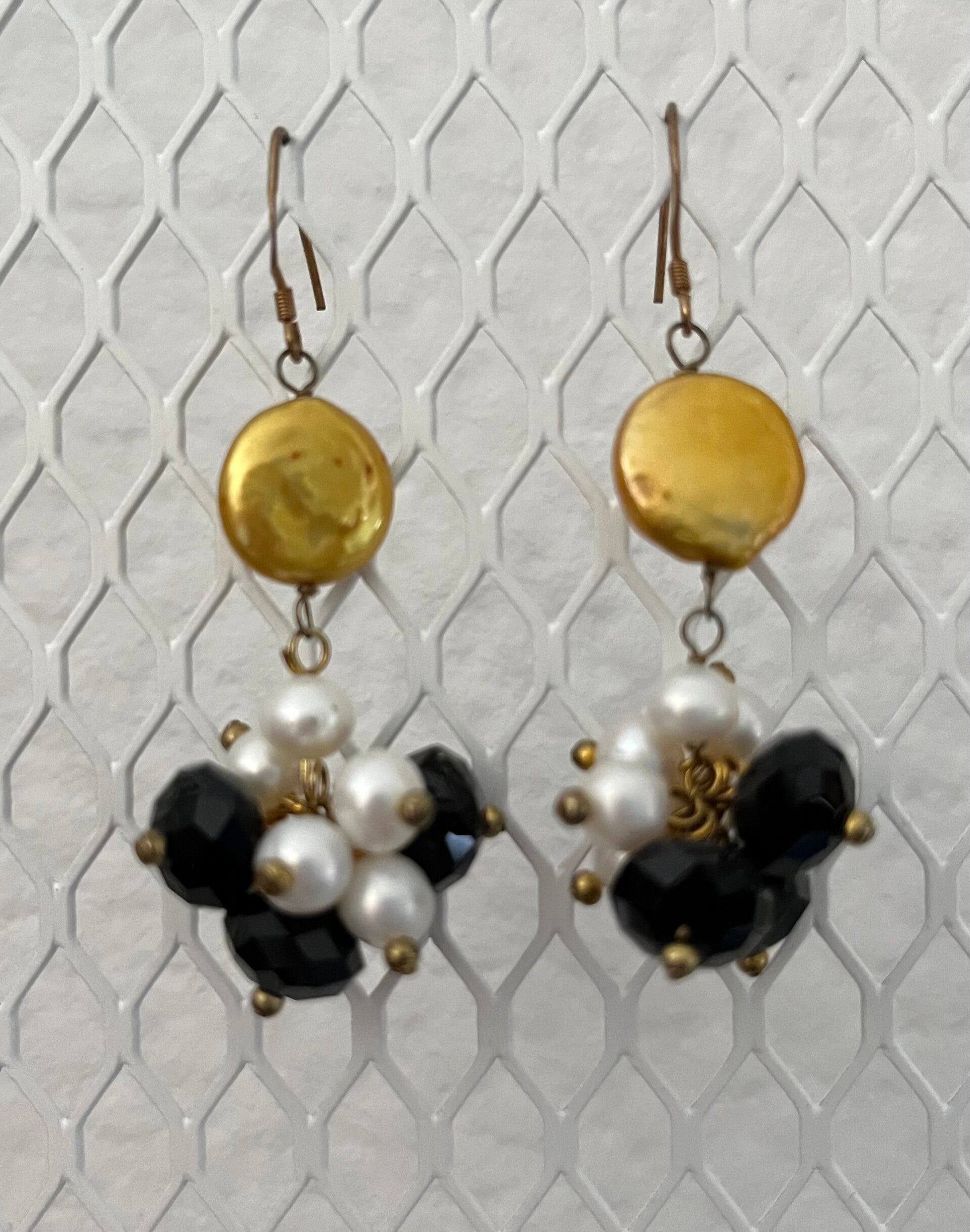 Oorbellen met parels, gele muntparels en zwarte kraaltjes
