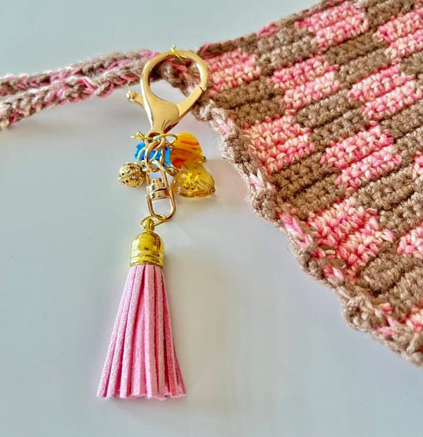 2 in 1 gehaakte clutch tasje met bijpassende sleutelhanger als extraatje erbij. De sleutelhanger kan er afgehaald worden.